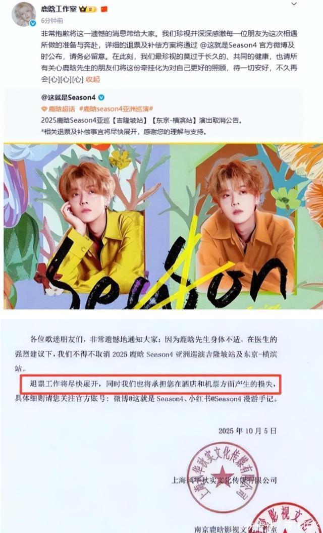 工作室发公告说“因健康原因”,粉丝们一边心疼一边犯嘀咕:以前总听说明星“带病坚持”,咋鹿晗就不能硬扛呢? 直到业内人透露,他最近三个月跑了12个城市,每场演唱会光跳舞就跳足90分钟,连轴转的彩排让膝盖旧伤复发,医生下了“强制休息”的命令。更难得的是,团队主动提出承担粉丝的机票酒店损失,这在娱乐圈可不多见。 从当年敢在顶流期官宣恋情的“真男人”,到如今爱惜羽毛拒绝透支健康,鹿晗的选择透着股子清醒。 娱乐圈最不缺的就是“拼命三郎”,缺的是知道何时该停下的智慧。咱老百姓看明星,图的不就是个真实吗?比起打肿脸充胖子,这样的“认怂”反倒让人高看一眼。
